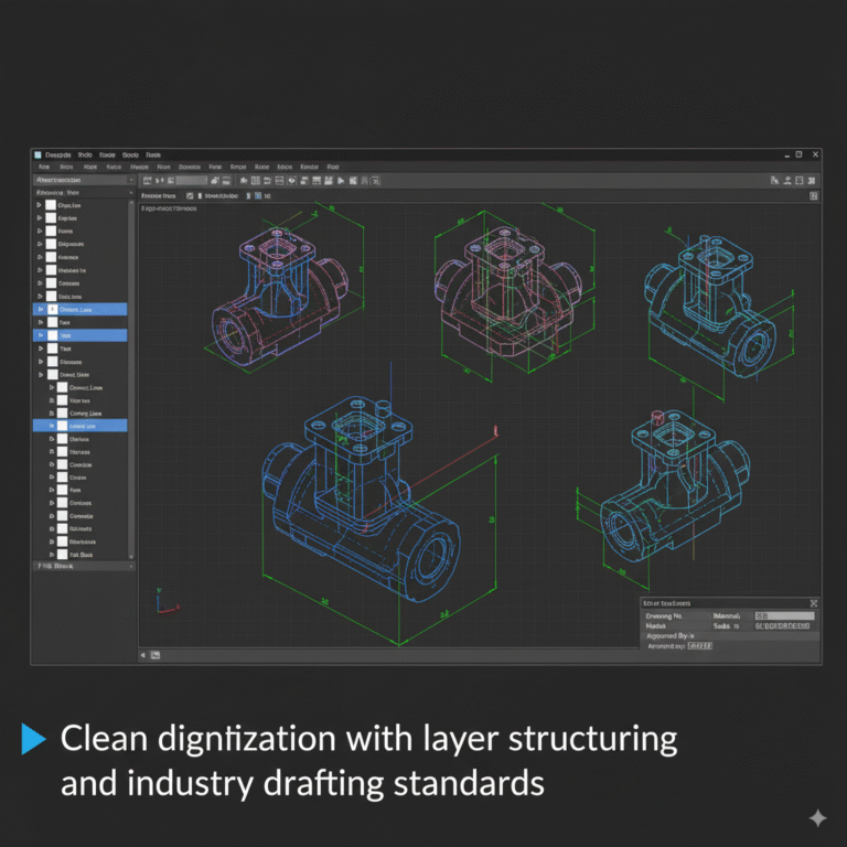 We convert legacy blueprints, hand sketches, and raster images into editable, layered digital formats. This allows your data to be archived, updated, and reused across digital platforms.